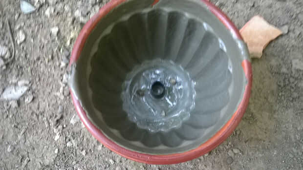 Luego ponemos la pieza del tubo en el centro de la olla y en la parte superior, el segundo bote blanco. Inicio vierte la primera mezcla a la diferencia entre los dos potes, después de poner algo de peso dentro de la pequeña para evitar que la forma flotante.