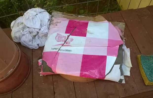 Después de 6-7 horas cortar la bolsa de plástico por la mitad y empezar a verter el agua sobre la superficie del concreto.