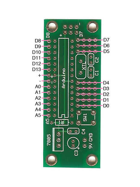 Nota: pin 7 - pin 10 tienen no hay brotes en la Junta. Para compensar los terminales de alimentación en las patillas 7 y 8 no se sacó, 3 energía extra y extra 3 cojines de suelo se han incluido a la derecha de la Arduino.