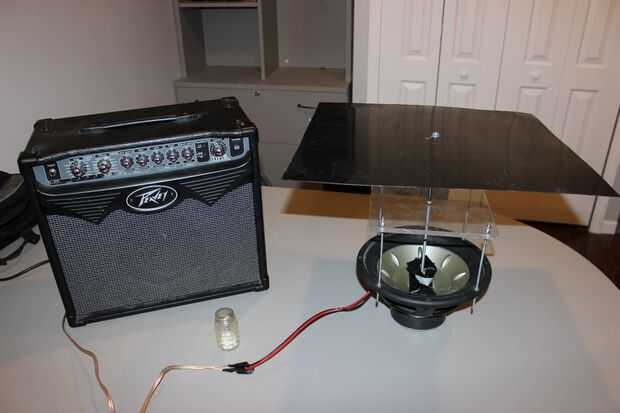 Pidió prestado pesadamente de estos dos proyectos en términos de la configuración. Sin embargo mi versión difiere de los ya que utiliza un altavoz estándar, sin modificar - simplificando enormemente el proyecto. Estas otras versiones implican modificar su altavoz para hacer un "controlador de onda". Bueno, uno arruinado altavoz y no intento más tarde estábamos decididos a averiguar una manera de usar sólo un ponente habitual (en mi caso utilicé un subwoofer). El método de controlador sólo parecía muy complicado - nunca pensé que lo... ¿todos estamos tratando de hacer aquí es vibrar la placa metálica, no puede ser eso la derecha de difícil? También hacía falta un poco de experimentación pero creo que terminamos con algo funcionó muy bien, todas las cosas consideradas. Fue al menos lo suficientemente bueno como para mi hijo una A su proyecto y tomar el primer lugar en la Feria de Ciencias!