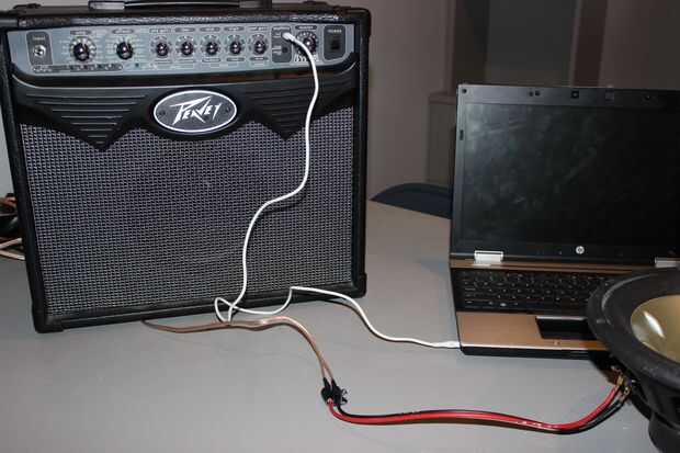 En lugar de utilizar algún generador de tonos complicados caros opté por ir a la ruta más barata posible - gratis! Utilizando cosas había alrededor de la casa... Básicamente he utilizado la Página Web de aquí En línea generador de tonos para generar tonos desde mi laptop a introducir en el altavoz. Sin embargo, porque el nivel de auriculares del ordenador no puede poder un subwoofer grande 8", tendrás que utilizar un amplificador intermedio. Se puede utilizar un receptor estéreo de casa o en mi caso - un amplificador de guitarra. Como tiene una entrada auxiliar de 3,5 mm jack de audio, debe ser bueno para ir! Usé el cable de audio de 3.5mm (a veces llamado un mp3) para ir de gato del auricular de mi computadora a la entrada aux de la amp. Entonces separado altavoz del amplificador en la parte posterior, y en su lugar funcionó un pedazo de cable calibre 12 para mi subwoofer. Más probable es que lo vas a conectar este será diferente que yo.