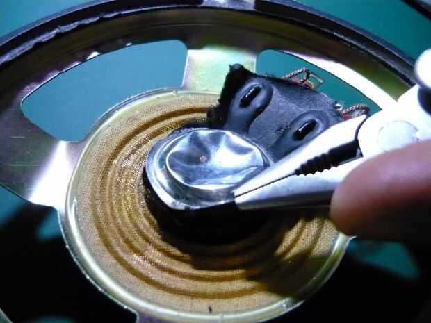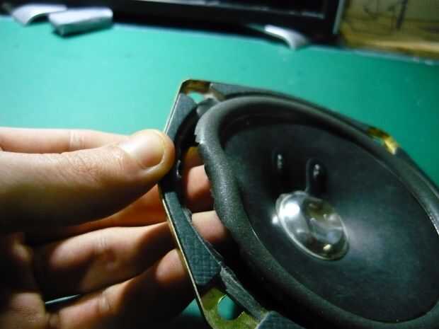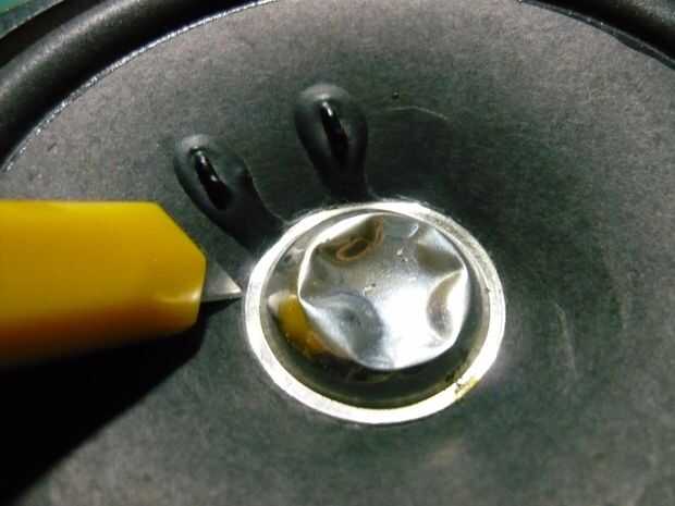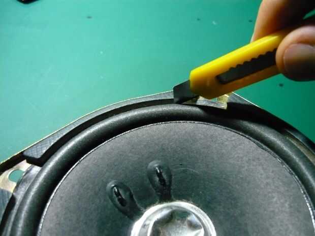 En primer lugar, con la navaja, corte alrededor del exterior del cono del altavoz hasta que esté completamente separado de la estructura metálica exterior.