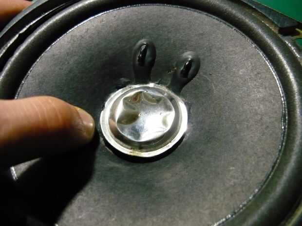 A continuación, ejecute cuidadosamente la hoja del cuchillo debajo de la tapa de polvo (que es la pequeña cúpula brillante en el centro) hasta todo desconectada el cono. Tenga mucho cuidado alrededor de los dos pedazos de plástico negro pegado al cono del altavoz, que contienen los cables que hacen correr el altavoz, así que asegúrate de no cortarlas.