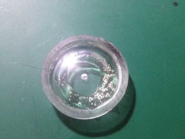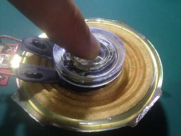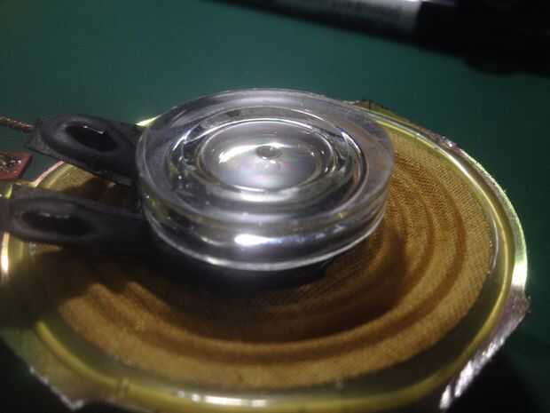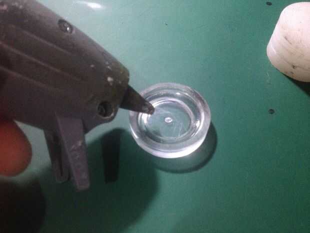 Entonces usando la pistola de pegamento caliente, aplique una cantidad abundante de pegamento caliente en el interior del disco, en forma circular que coincide con la bobina de voz del altavoz.