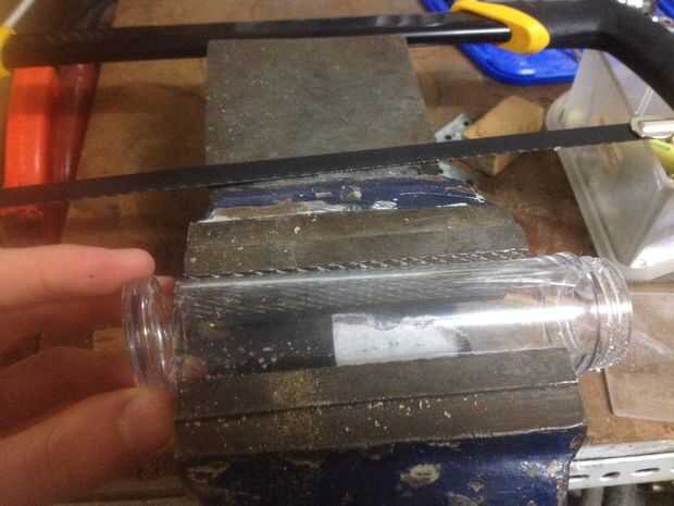 En primer lugar, cortar la base del tubo de plástico con la sierra para metales y limpiar los bordes del corte con un papel de lija grueso.