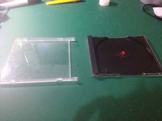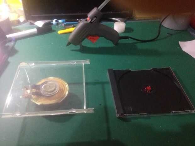 Después de aplicar una gota de pegamento caliente en el disco plástico grande del paso anterior, coloque la parte clara de la caja del CD en la parte superior, centrado como mejor puede y presione suavemente durante unos segundos, hasta que el pegamento se seque.