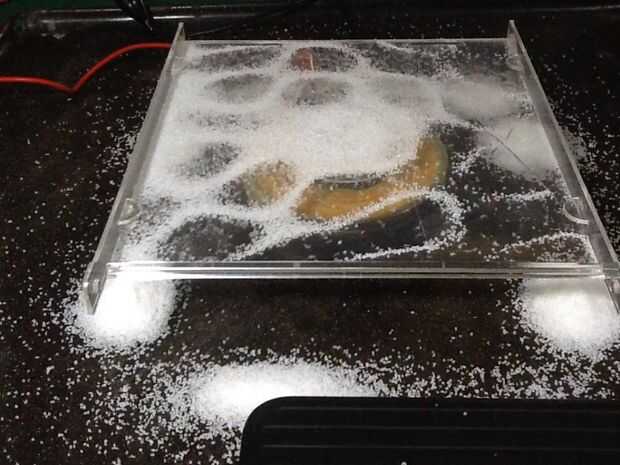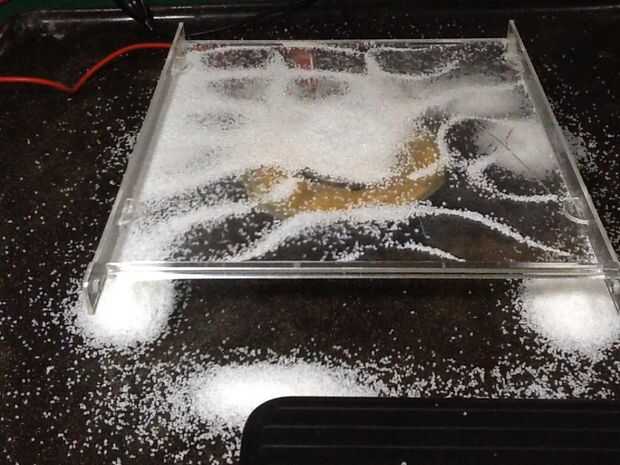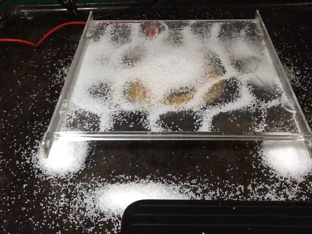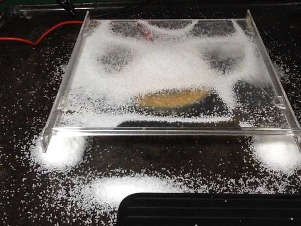 Se encuentra en ciertas frecuencias, resonará en la placa, causando la sal para formar interesantes patrones, que se convertirá en más complejos con frecuencias más altas.
