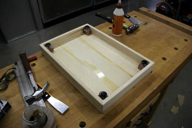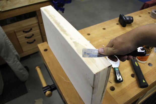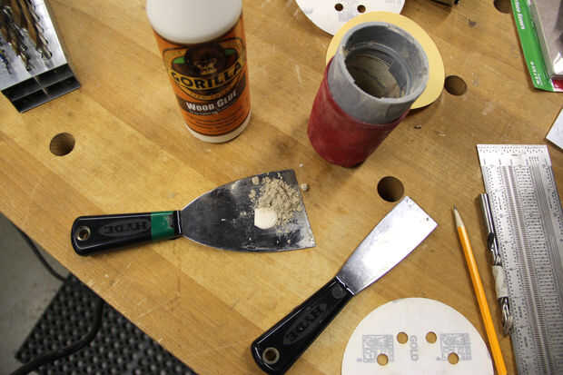 Hubo un ajuste muy apretado entre la falda y la parte superior al que les pegan, pero todavía había algunas grietas finas. Hice mi propia madera masilla con aserrín de coleccionista de la lijadora de Palma y una cucharada de pegamento para madera. Hay infinitas variedades de masilla de madera, pero esto es una forma rápida para asegurarse de que la masilla se corresponderá con la madera.