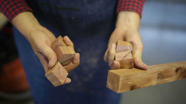 Puesto que la Junta va a tener patas regulables, corté unos 1 1/2 "X 1 1/2" X 1 "bloques de cedro para los pies para atornillar utilizando las tuercas en t.