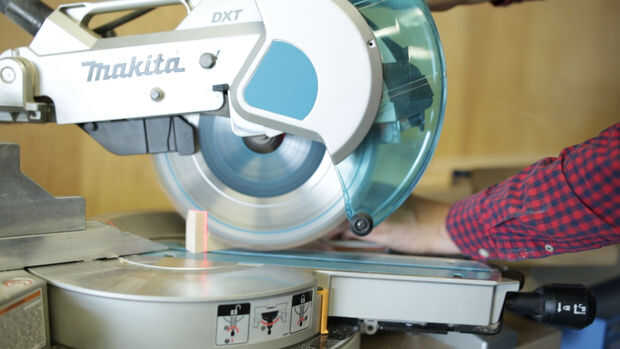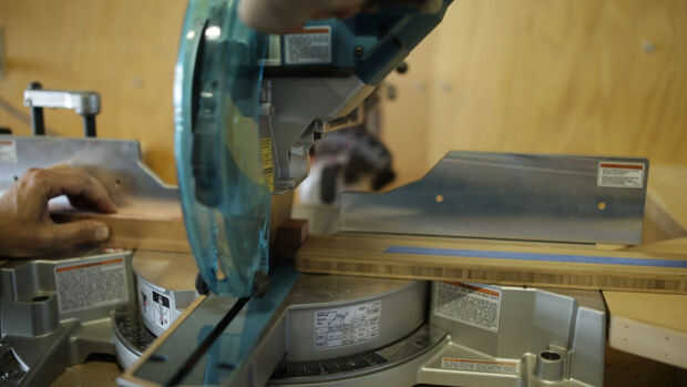 Cortar unas cuantas longitudes de 1 3/4" ancho tablas para hacer la falda y me los de una sierra radial del brazo ingleteando. Esto es fácil de hacer con una sierra de mano y una caja de ingletes si no tienes uno de esos. Los tamaños de la falda son los siguientes: