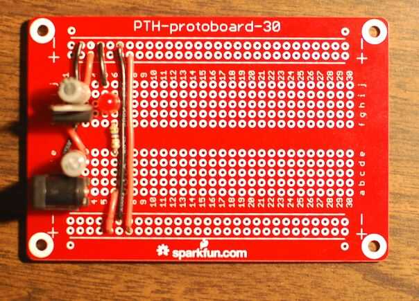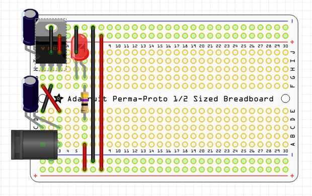 En mis diagramas estoy usando el tablero de tamaño Perma-Proto de Adafruit 1/2. Estoy recomendando la parte de SparkFun porque los agujeros para los carriles de la energía alineen con un protoboard estándar. En la parte de Adafruit los agujeros están más cercanos juntos. Esto no es por criticar la parte de Adafruit, pero la parte de Sparkfun es más adecuada para este proyecto.