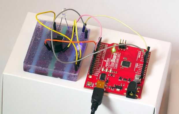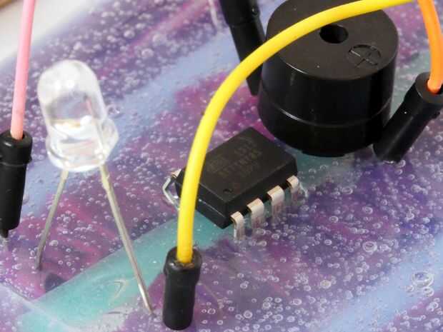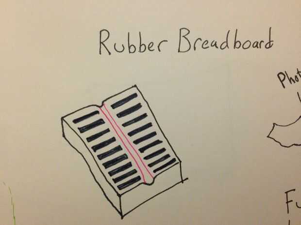 Una goma completo tablero de pan es bueno porque la electrónica puede ser presionada en la goma bien, y una vez que el circuito establecido, puede adherirse la protoboard directamente a una escultura de silicona.