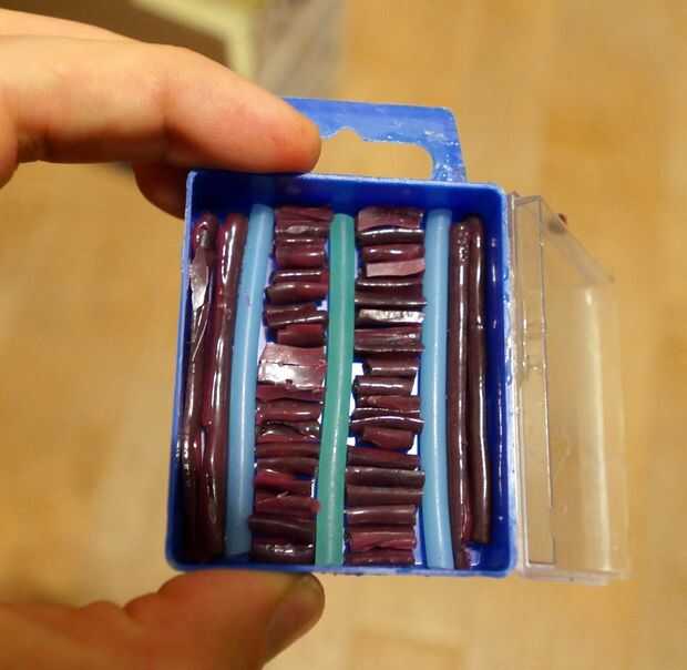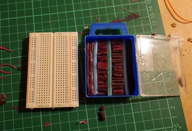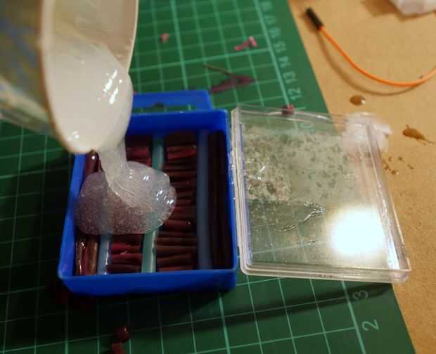 Cuando tengas estos bits aislados, cargarlos encima de firmemente al lado del otro en una especie de contenedor para mantenerlos juntos (encontré una bonita caja). Usé pedacitos de goma NON-CONDUCTIVE para crear los vacíos dividiendo áreas de un tablero tradicional.