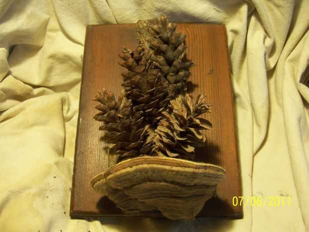 Elegir sus piñas y temporalmente los ponen en la placa. Elija una seta de la base que se adapte a su gusto. (No probarlo!) Línea todo y ver cómo va a buscar. Oh, sí antes pega cualquier cosa, soy voltee la placa y conectar uno de esos cuadro suspensión thingys ahora. Causa más adelante será demasiado difícil para uñas en piñas y shroom conectado! Estado allí y hecho eso!! Ahora pegar todo por lo que parece agradable y simétrica. Como un arreglo de flores. Vea la primera foto. Ahora, deje que se seque. Colgar en algún lugar y disfrutar de las alabanzas de su familia y amigos. Pero ten en cuenta que todos querrán uno demasiado, así que espero que tienes hongos y conos de pino extra!!!! Disfrutar, buscar la paz, Triumphman.