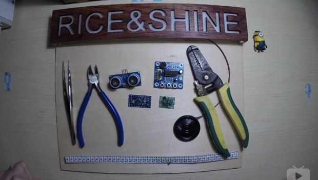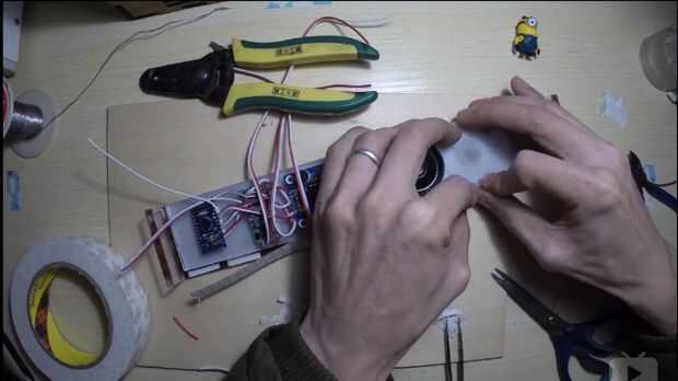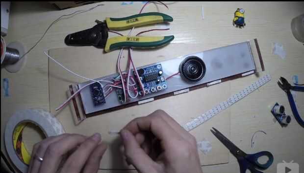 Básicamente hierro-suelda el arduino promini, micrófono, módulo ultra-sonic juntos y usar cinta de doble cara para pegar en la parte posterior del acrílico.