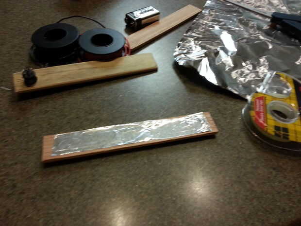 Ahora perfore un agujero de 5 pulgadas para el conmutador en cada extremo. Entonces cinta de papel a la superficie de la madera con el agujero y a uno con el agujero.