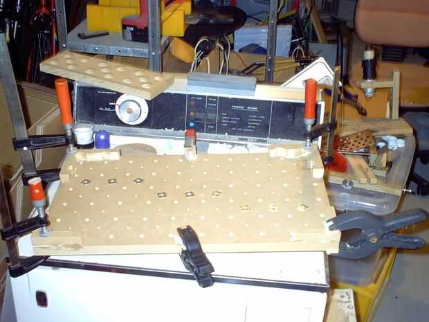 Espaciadores van debajo de la tabla para levantarla de la superficie. El espaciador debe ser más profunda que una cabeza de perno M10 + arandela M10. En mi caso solo usé más de lo 18mm MDF. Traté de ser complicado y obtener un área decente dejando espacio libre alrededor de los orificios del perno. No era particularmente acertado y tratar de utilizar una arandela ancha en los orificios de esquina no es muy fácil. Tratando de entrar una llave para apretar un perno también no es fácil.