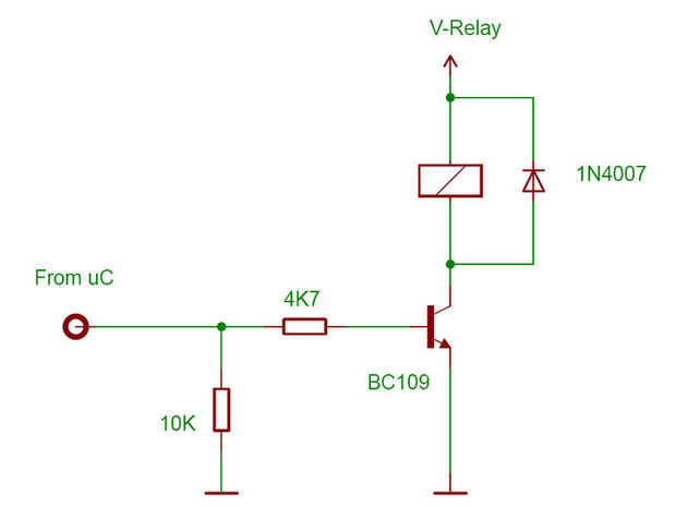 El transistor se utiliza para aumentar la corriente disponible para controlar un relé. Con sólo 1mA de la clavija del micro controlador, el transistor puede conmutar una carga de 100mA. Más que suficiente para la mayoría de los tipos de relés.
