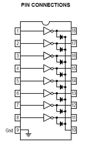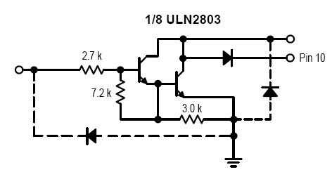 Este ULN2803 tiene 8 circuitos de transistor individual, cada circuito con todos los elementos necesarios para cambiar un relé.