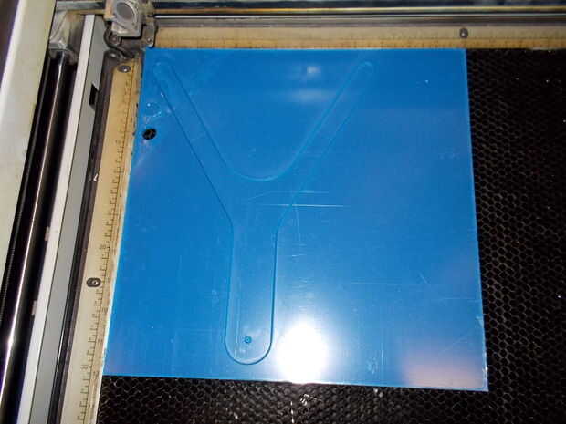 Siempre tomar cortes de prueba antes de la corte real, que es los círculos en la parte superior izquierda. Con la cantidad de uso de que los láseres bajarse el Techshop, sólo usar a las guías de corte como punto de partida. Además, siempre que sea práctico, corté con el protector plástico a la izquierda, para ayudar a prevenir las marcas de la mancha.