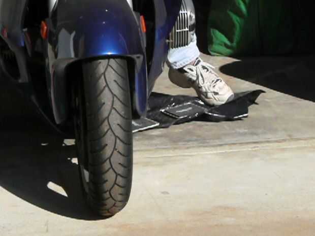 Quitar la bicicleta del centro de soporte de manera normal. Esto es donde que poco extra de plástico a la izquierda de la "placa giratoria" viene muy bien. Si eres como yo, tienes a horcajadas de la bicicleta para obtener el soporte del centro. Una vez que la moto descanse sobre las ruedas y el soporte del centro ha subido, puede utilizar el pie izquierdo para patear lejos el plástico deslizando ese pedacito de plástico lejos de ti, a pesar de que todavía están entre la moto. Los reguladores son el plástico, así que van con él, y ahora han quitado el "tocadiscos" debajo de la moto. Así ya estás listo para ir a pasear sin la conducción sobre el plástico o los controles deslizantes de muebles!