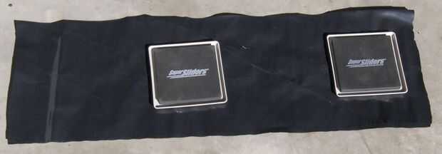 Corte y doblar la láminas para hacer un rectángulo de varios espesores de plástico, y poner los controles deslizantes de muebles en la parte superior como se muestra aquí. El extra de plástico que se pega hacia fuera a la izquierda es opcional pero será muy útil más adelante.