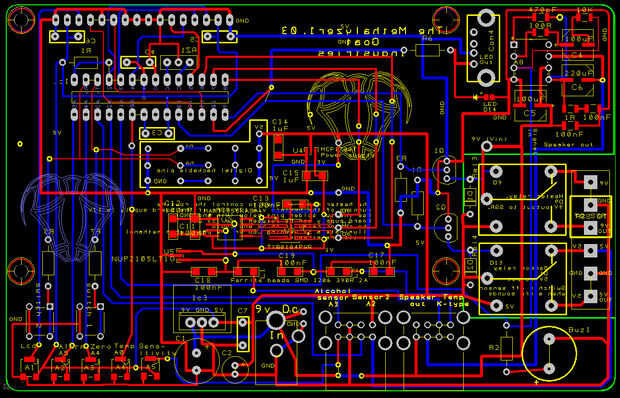 Mi tabla anterior, aunque trabajó bien, sería una pesadilla para hackear ya que es muy pequeño y compacto y las pistas no están bien organizados. Tenía un circuito de termopar de tipo K en el centro, un amplificador de audio en la parte superior derecha y una pantalla LCD de 4 x 20 en la parte superior izquierda, que cubrió gran parte de la Junta. Uno de los principales problemas era tener constantemente a sacar el chip Atmega y encajar en un Uno para hacer los cambios de pragramming.