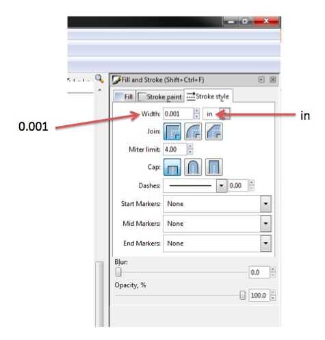 En la pestaña estilo de trazo, cambiar las unidades de px a adentro y establecer el ancho a 0.001, esto vectorizar el contorno y hacer el láser corte el contorno.