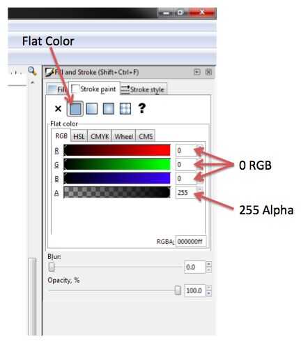 En la pestaña pintura de trazo, seleccione Color plano y mueve los deslizadores de R, G y B a 0 y A 255 para hacer el contorno sólido negro.