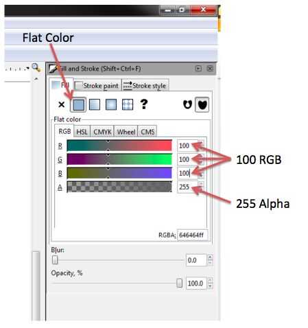 Con el cuadrado seleccionado, abra el cuadro de diálogo relleno y trazo en el menú "Objeto". El cuadro de diálogo de relleno y trazo incluye 3 pestañas "Llenar", "Pintura de trazo" y "Estilo de trazo". En la pestaña de relleno, seleccione la opción Color plano y mueve los deslizadores de R, G y B a aproximadamente 100 para crear un relleno gris sólido dentro de su rectángulo. También, asegúrese de que la A (alfa/transparencia) se encuentra a 255 para un relleno completamente opaco.