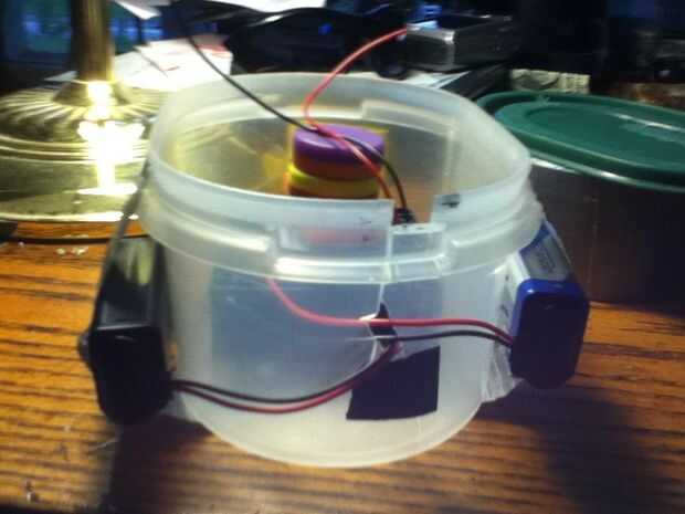 Rápido de la batería dos se encaja en las dos baterías y los cables por el conjunto de la alimentación en el Tupperware. Conecte el cable positivo de un broche de presión con el cable negativo de la otra. Yo sólo les había torcido y luego poner cinta aislante alrededor de él, pero para una conexión más robusta se suelde.