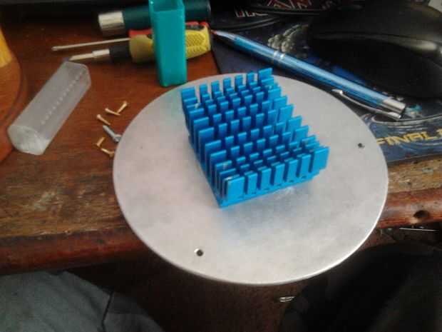 Encontré un bonito azul CPU disipador de calor en mi caja de chatarra de pc y fija a la parte inferior de la placa con un tornillo autorroscante cabeza avellanado. Las aletas hacia abajo frente a atrapan el calor y reducen el flujo de aire caliente para arriba alrededor de la placa que parecía seca rápidamente la almohadilla mojada a, desgraciadamente se calienta la placa incluso más rápido y a más de 110 * c el límite de mi sonda digital. La llama del quemador de alcohol era sólo grande no importa cuán bajo usted rechazó la mecha, tendría que reducir algunos cómo la llama.