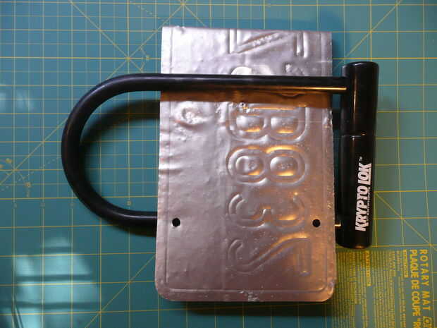Coloque la placa a través de su candado para que el extremo doblado previamente es debajo de la cerradura y el revelado final está por encima de la cerradura. Doblar la mitad ascendente sobre la barra de la cerradura.