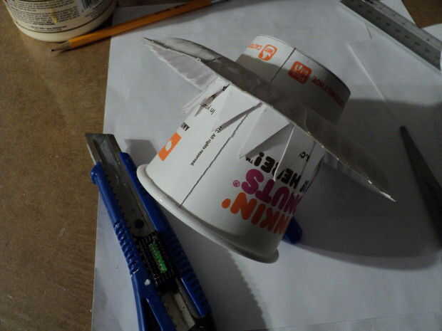 La parte superior de la taza que sobresale a través del platillo estará apoyando a la sección de platillo superior. Cortar la Copa a la altura y bengalas hacia fuera.