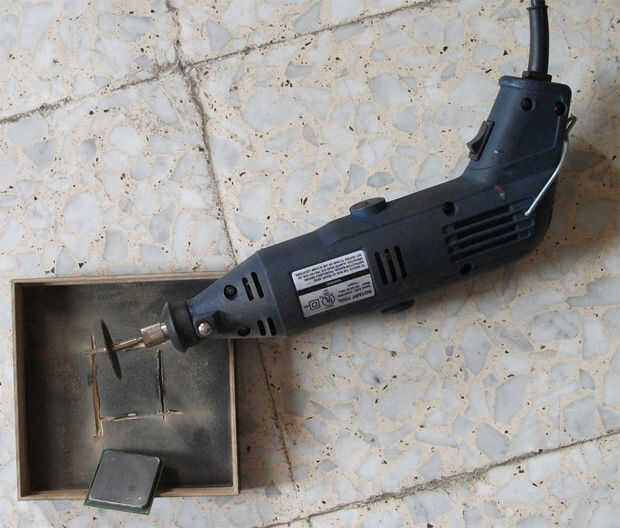 Ahora poner la CPU sobre la base que elegido y marcar un cuadrado para perforar con el dispositivo rotatorio. La Plaza debe ser un poco más grande que la CPU. La razón detrás del agujero más grande es para asegurarse de que la CPU caliente no toque la superficie de madera de la base. No va a poner en llamas, pero va a producir un desagradable olor a quemado.