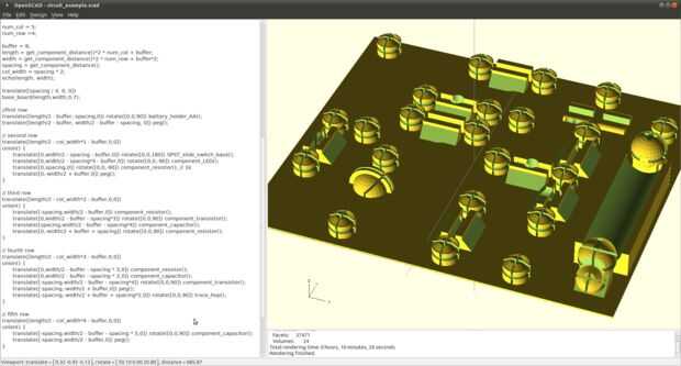 Colocar los componentes con llamadas a la biblioteca, junto con traducir y girar sobre z, con tantos componentes compartiendo las clavijas como sea posible. Tip: OpenSCAD tiene dos opciones de representación: un render rápido y un renderizado completo. Sugiero usar el 'render rápido' (F5) para escuchar colocando componentes. Pero no trate de girar o mover el modelo 3D prestado, esto sólo funciona bien después de un 'render completo' (F6) que en este ejemplo se llevó alrededor de 10 minutos!