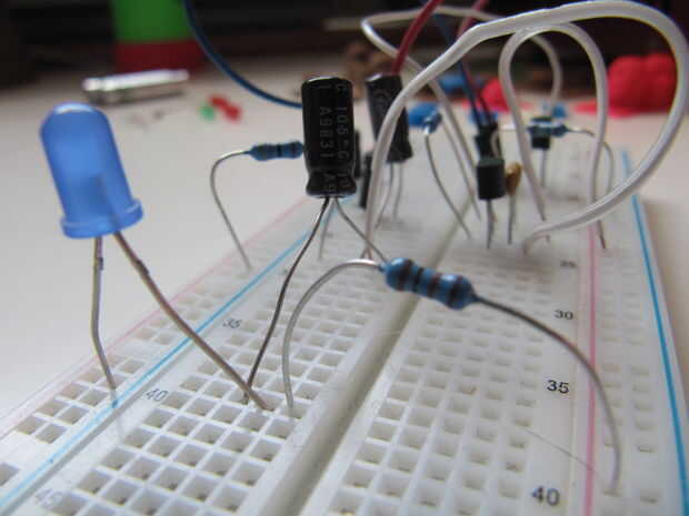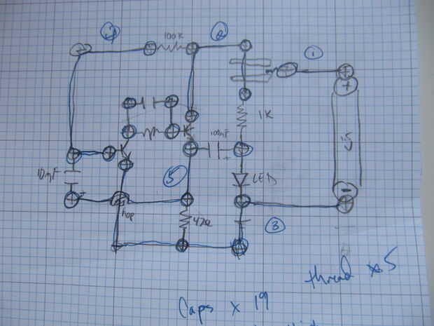 Cada componente en la biblioteca tiene un espacio estandarizado: las clavijas que forman parte de un componente son una distancia fija del centro de ese componente. Este valor puede accederse mediante una llamada a 'get_component_distance()'. Si organiza los componentes en filas y columnas como en el ejemplo, la distancia entre las filas y columnas debe ser 2 veces esta distancia. Entonces si los componentes se colocan al lado de uno en esta red, pueden compartir una peg. Esto siempre que sea posible, y se minimizará el número de hilos que necesita para envolver. Las tapas que van encima de las clavijas celebrará sus componentes a una conexión ajustada.