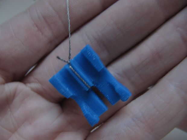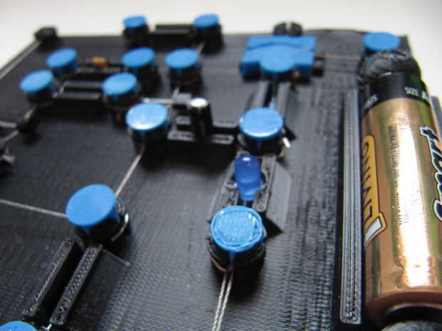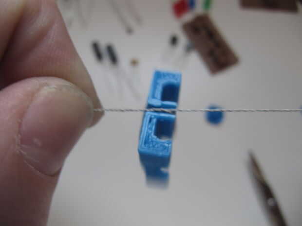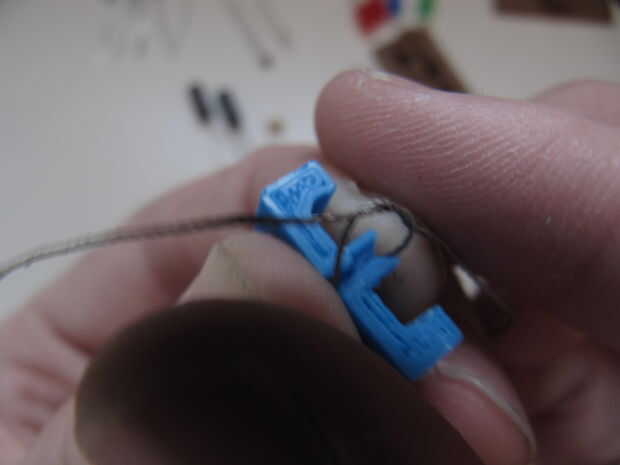 - Interruptor: este tiene dos componentes. La base del interruptor se coloca en tu circuito y tiene dos pinzas a cada lado. Conectar un extremo del interruptor envolviendo estas dos clavijas, pero asegúrese de que el subproceso ejecuta directamente a través como en la imagen. Para la segunda parte, comenzar con la palanca por separado impresa. Forma un bucle alrededor de la parte frontal del interruptor, donde se realizará la conexión con el hilo que sólo ejecutó. Seguir el hilo a lo largo de las ranuras y un nudo en la parte trasera del interruptor, lo mas ajustado posible. Cortar el hilo sobrante, pero está bien dejar un poco ahí. Una vez hecho esto, coloque el interruptor en el circuito (aún con el otro extremo del hilo sin ataduras). Asegúrese que el interruptor esté en la posición ON antes de que envuelva la rosca floja alrededor de la otra clavija, de lo contrario no habrá suficiente holgura y va bien no ser capaz de cambiar, o a forzarla y enganchará el hilo.