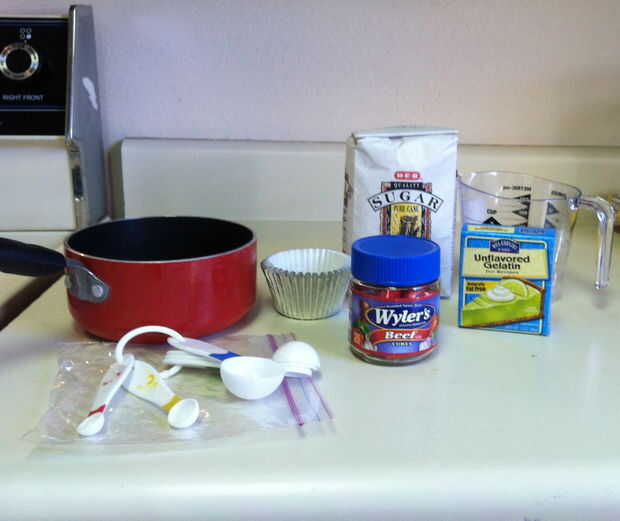 Este proyecto debe tomar 30 minutos o menos, incluyendo el tiempo asignado para que la mezcla se enfríe en las tazas de papel de aluminio. El costo de los ingredientes que requiere total fue $8,17 y la receta es para 6 placas de gelatina nutritiva.