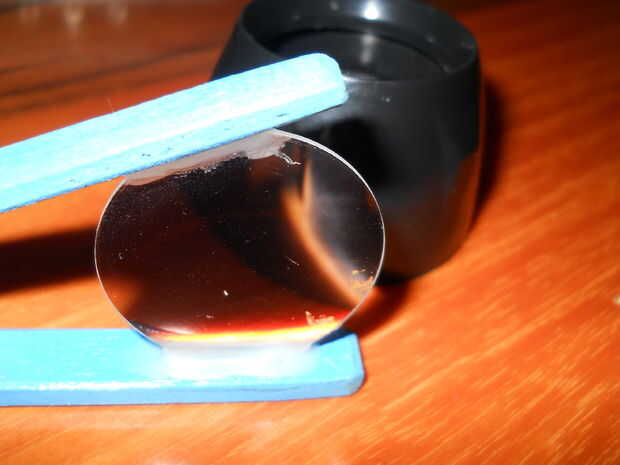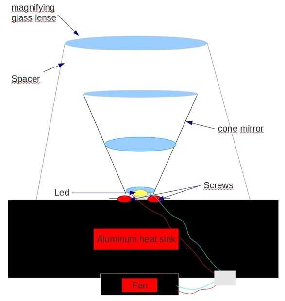 5° - con un espaciador, una vez más tomar una linterna pequeña, añadir una cuarta lente (hecha de una pequeña lupa de mano) a LED centrado una vez más.