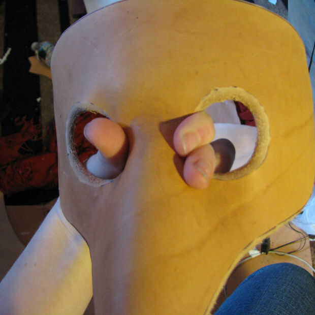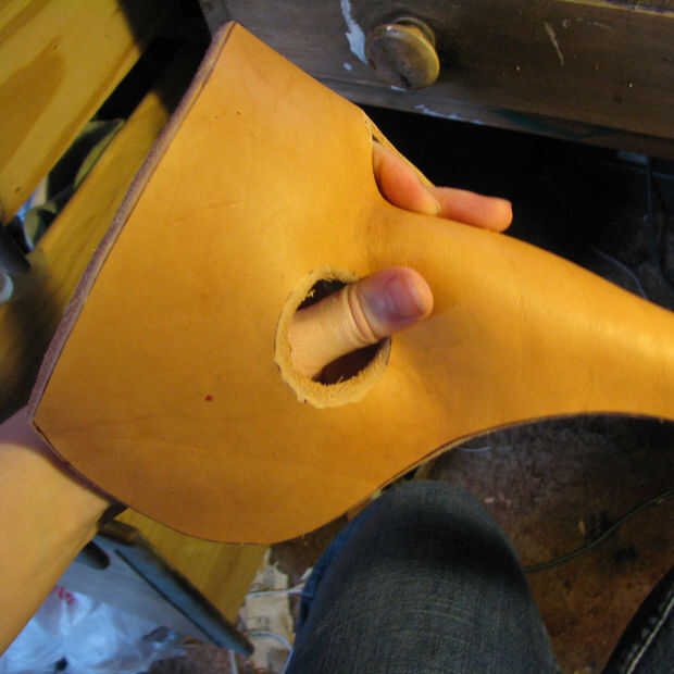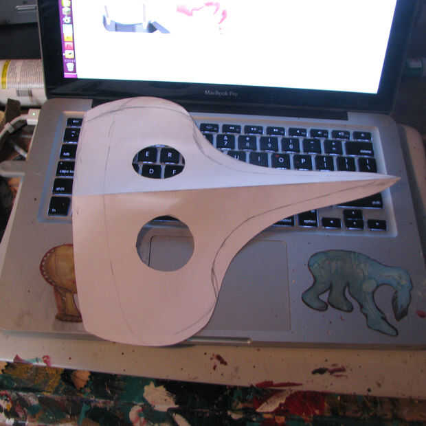 Rastro en la piel más gruesa. Corte. Remoje en agua y moldear en la forma correcta. Usar su cara para hacerlo bien. El pico puede tomar un tiempo. Sólo mantenga en él.
