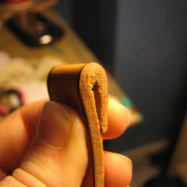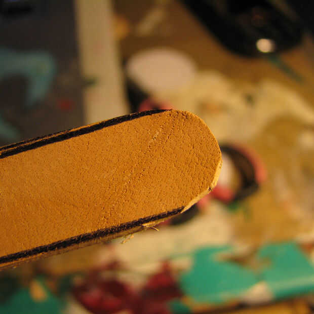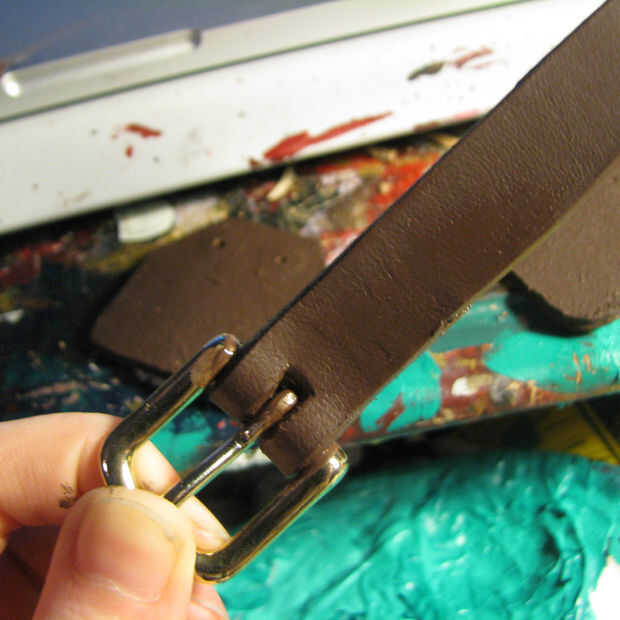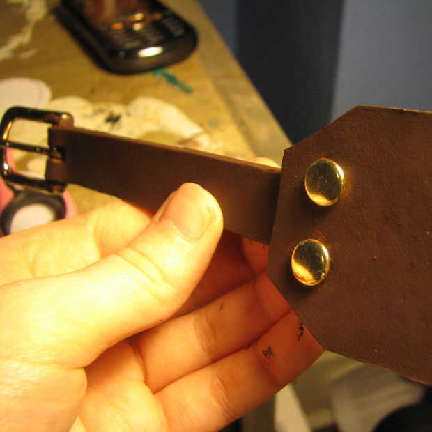Yo estúpidamente no pintaba mi tira marrón antes de este paso. Te recomiendo que hagas. Luego del pegamento estupendo de su piel para mantener la hebilla en su lugar. Si te sientes elegante puede utilizar un remache. Pero odio los remaches y remaches me odian.