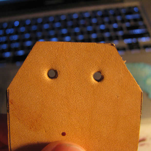 Cortar dos piezas de cuero en esta forma. Perfore dos orificios de agujero como tal. Pintura.