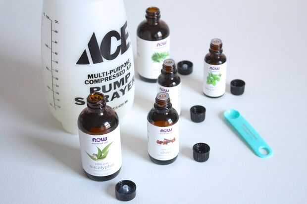 Ahora usted querrá añadir sus aceites esenciales. Necesita aproximadamente 1,5 cucharaditas total. Hemos utilizado un poco más de 1/4 cucharadita por cada aceite: jengibre, Romero, clavo de olor, menta y eucalipto.