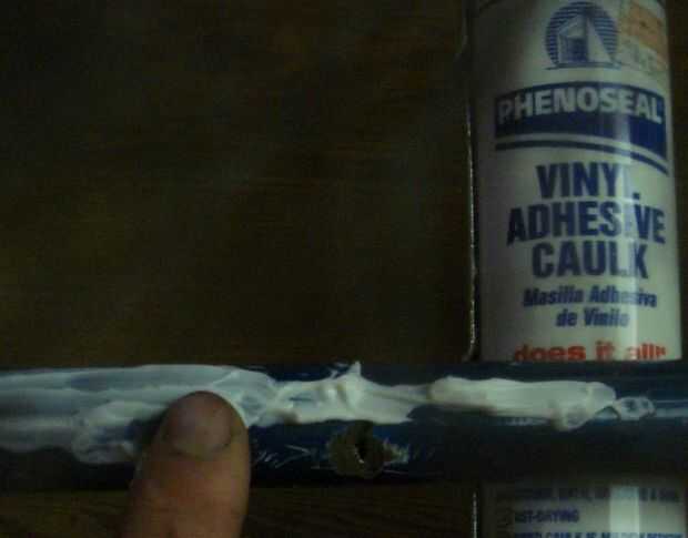 Utilizando Phenoseal vinilo adhesivo translúcido para calafatear (este es el pegamento) aplica una pequeña cantidad a lo que se verá más dejando la costura de la espalda. Cuánto grano depende de cuánto de él se puede propagar en cubrir una media pulgada. Gruesa o delgada, demasiado poco. Difícil decir cuando no sabes. Esta es la parte que aprende haciendo. Demasiado poco no adherirse bien y también mucho a supurar a través de la tela. Podría supurar a través de ahora y después y que va a estar bien. La imagen muestra un poco demasiado se aplicó.