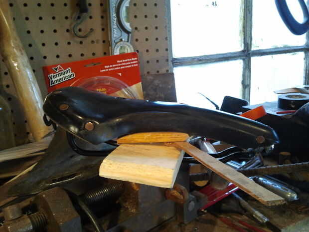 Inserta bloques de madera y cuñas entre los rieles para darle forma y sostener las solapas plegables en su lugar. Lo que estaba buscando era, como la golondrina, una aleta ocultada que sigue la línea recta del corte, pero da fuerza y rigidez a la silla de montar.