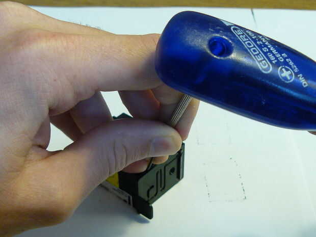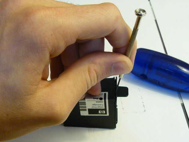 La parte más difícil es romper abierto. Estos cartuchos están diseñados para quedarse cerrado. Haz unos finos utilizar destornilladores y un martillo pequeño destornillador grande. Con cuidado coloque el destornillador en el borde y golpéelo en la orientación hacia los inyectores (abajo). No llegar hasta el final del primer tiempo, moverse alrededor y profundizar en cada paso. Debe evitarse la parte posterior, irá cuando el frente va y tiene que dañarse lo menos posible.