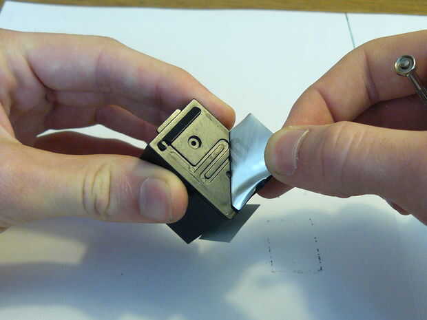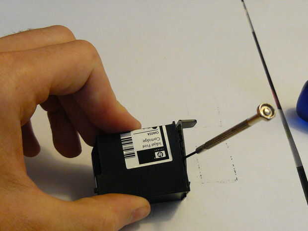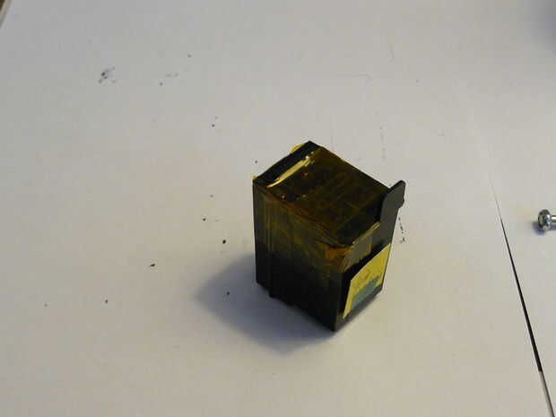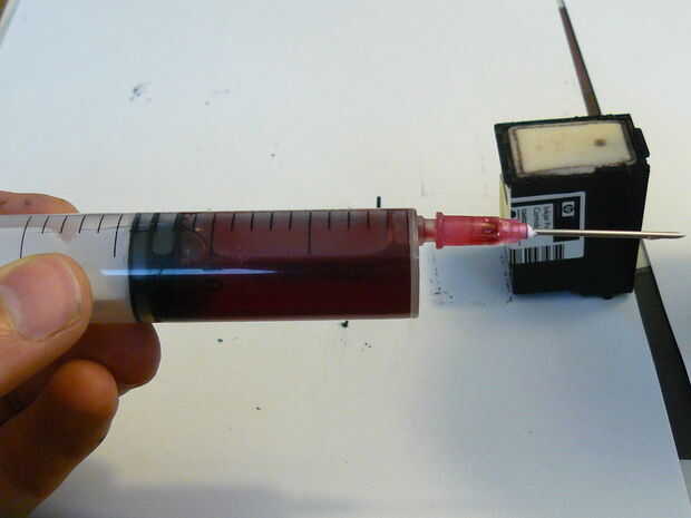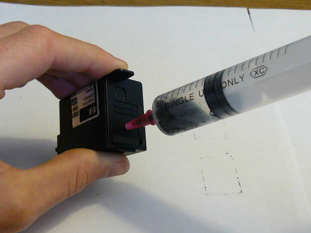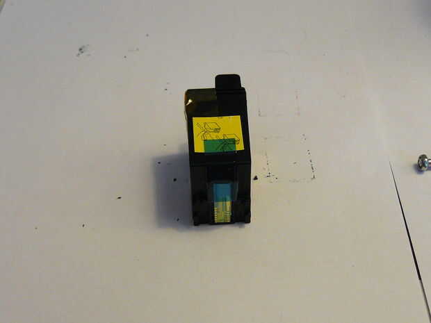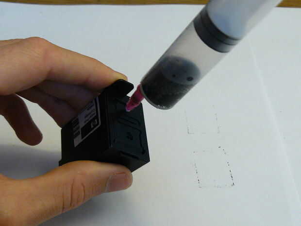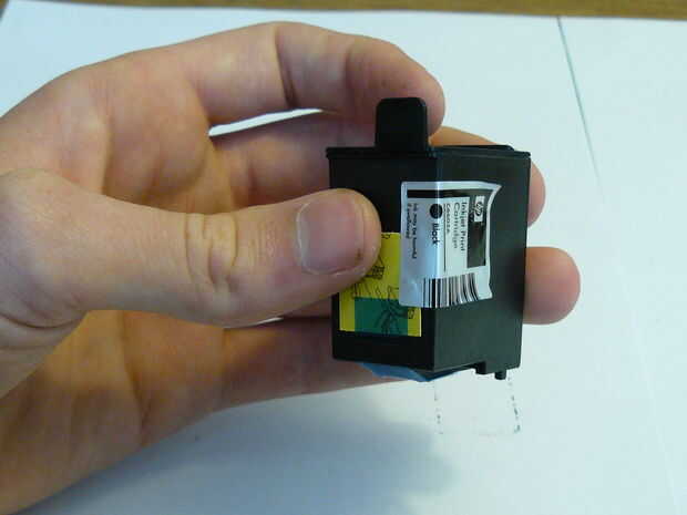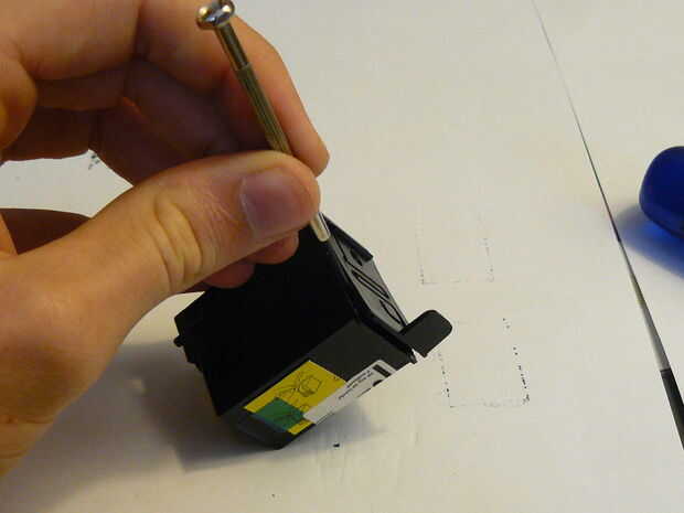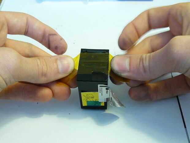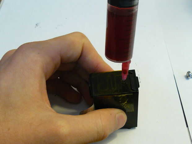 Cuando el cartucho esté limpia y seca, puede ser cerrado otra vez y llena de un líquido de su agrado. Prefiero añadir una pequeña cantidad de colorante para que la impresión es visible. Hay un laberinto en la parte superior del cartucho. Cierre la parte superior ya sea con la etiqueta eliminado al principio, o un trozo de cinta, pero deja abierto el agujero al principio del laberinto, otra el cartucho dibujaremos un vacío durante la impresión.