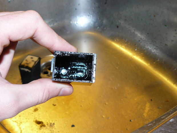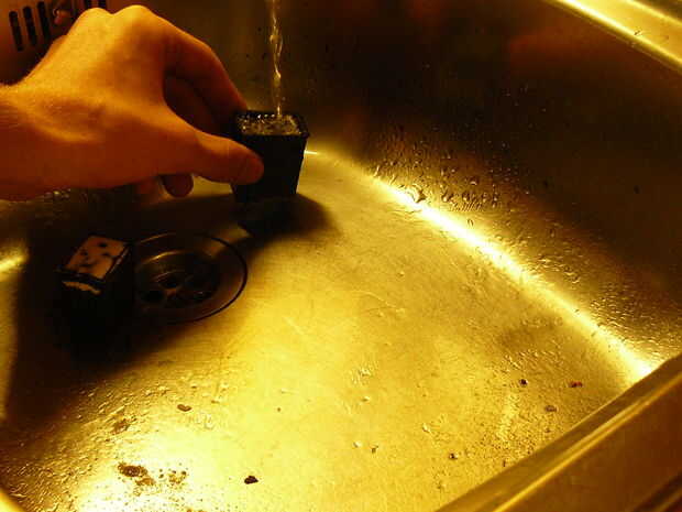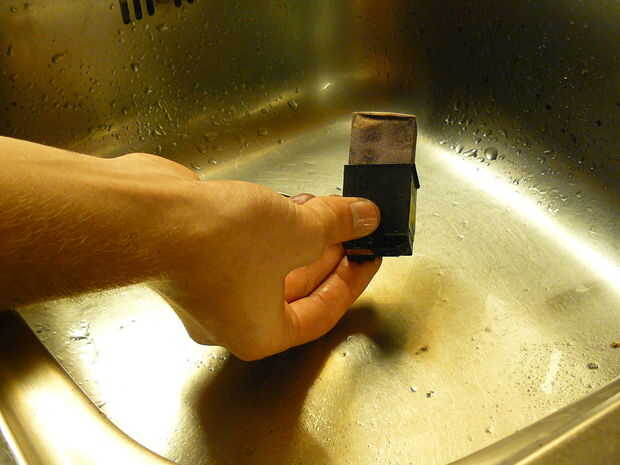 Cuando el cartucho está finalmente abierto, quite la esponja sobre un fregadero. Luego vaciar la tinta restante y exprimir la esponja. Como hay agua presente, la tinta no se establece.