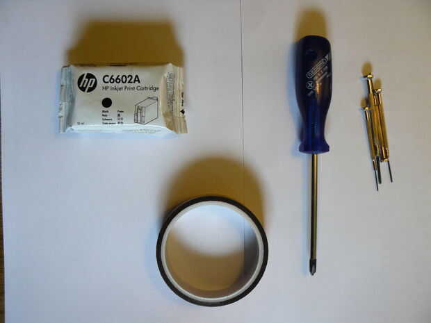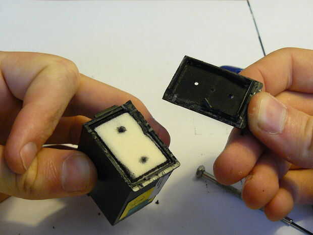 C6602 cartuchos se utilizan para la impresión. Generalmente están llenos de tinta. Ideal para el papel, pero menos grande para la impresión 3D. Antes de hacer una buena impresión, esta tinta debe reemplazarse con la carpeta. Mi experiencia personal con simplemente lo drenar con una jeringa han sido decepcionantes, así que empecé rompiendo los cartuchos y limpiar correctamente la esponja.